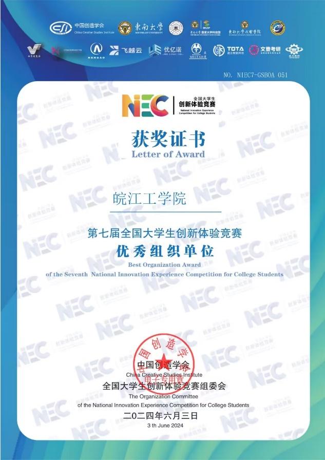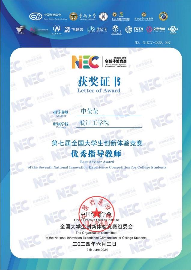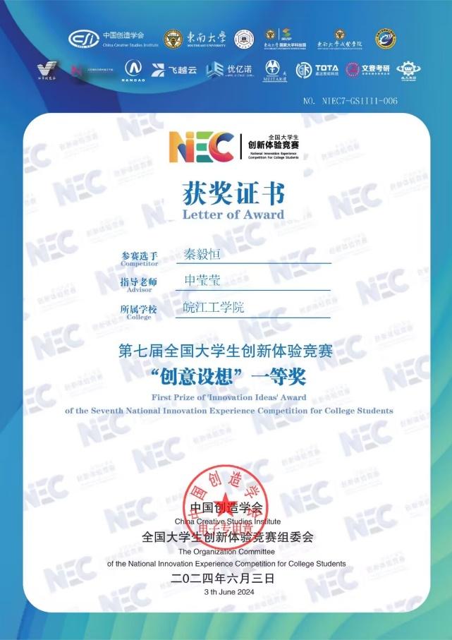 近日,第七届全国大学生创新体验竞赛总决赛落下帷幕。本次比赛于2024年5月在线上隆重举行,吸引了来自全国各地的众多优秀选手参赛。经过网络初评、复赛以及决赛评委会在线答辩评审等环节的激烈角逐,我校学生表现优异,秦毅恒同学获得全国一等奖一项,徐国斌、马骋骋、丁源同学共夺得全国三等奖三项,华体汇apk荣获“优秀组织单位”称号,申莹莹老师获得“优秀指导老师”称号。