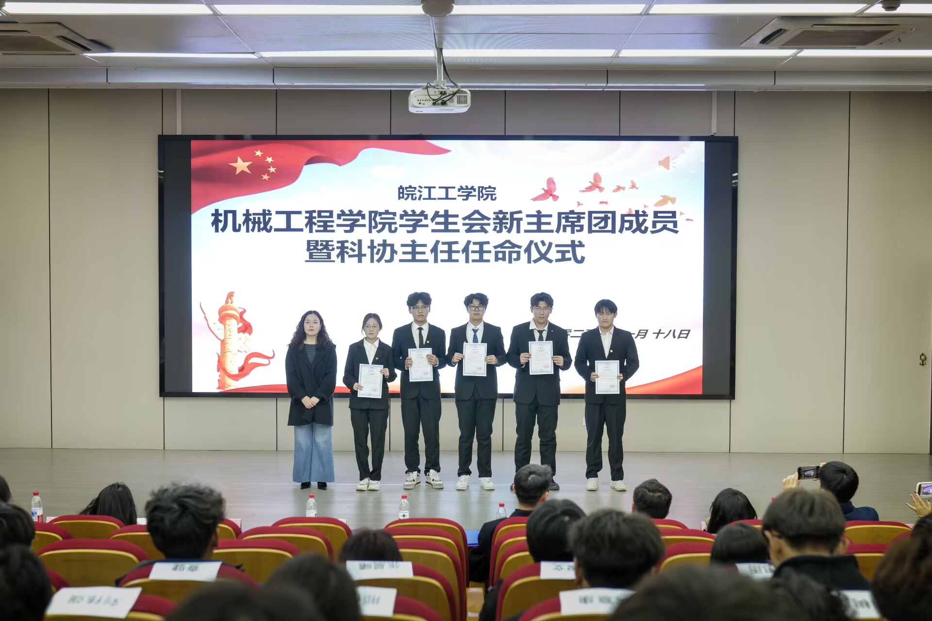 为进一步加强学生组织建设,传承服务精神,注入青春活力。2025年11月18日,华体汇apk机械工程学院第十一届学生会换届大会暨科协任命大会在郑蒲港校区图书馆举行。院党总支副书记颜婷婷,团委书记汪娟,各年级辅导员,第十届学生会成员、第十一届学生会及科协新任成员出席大会。