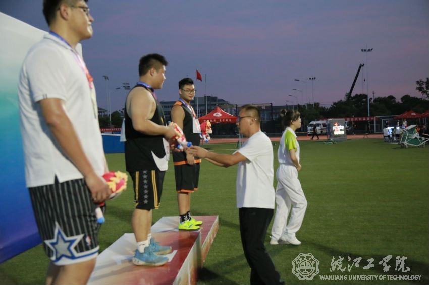 铅球赛场上,每一所高校的参赛运动员实力都非常强大,面对压力,我校运动员不仅没有畏惧,反而更加兴奋,在教练的指导下不断调整自己的情绪和状态,在比赛中实现了自我突破。周伟同学在第四投掷出12.86米的成绩,力压群雄,勇夺金牌,这一成绩让全场情不自禁发出欢呼声,其他高校的运动员和赛场裁判员都为之折服。这一成绩是其暑假以来头顶烈日、冒着高温酷暑刻苦训练的收获。永不言弃、永不言败的精神给了他公平的回报,让他创造了奇迹,这也是我校广大学子勇争上游、追求卓越的精神在田径赛场上的生动写照!颁奖仪式上,张建玉老师作为特邀颁奖嘉宾,亲自给我们的运动员戴上金牌,画面感尤为温馨!