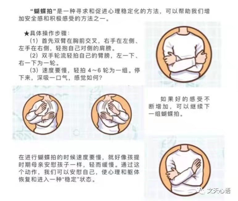 ③学会一些情绪放松的方法和技巧:比如逐步放松、蝴蝶拍等,让躯体感受带着你的情绪一点点发生变化。