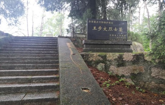 大别山烈士纪念馆的后方就是王步文及其妻子方启坤的墓。墓碑上用浮雕雕刻着王步文烈士的一生,丹心照汗青也是他一生的写照。