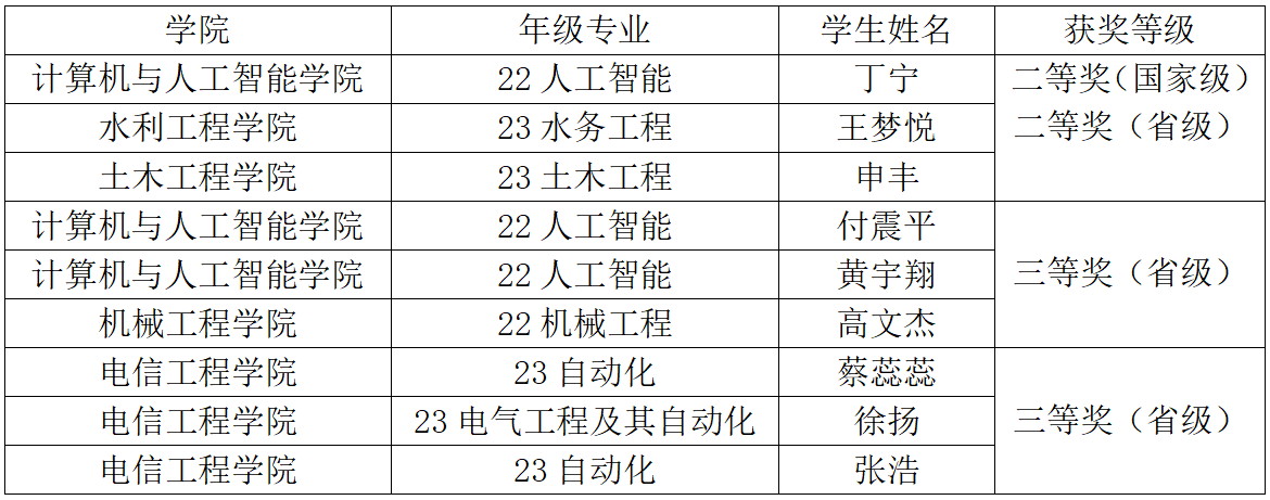 其中,计算机与人工智能学院丁宁(22 人工智能)、水利工程学院王梦悦(23 水务工程)、土木工程学院申丰(23 土木工程)组成的团队,获全国二等奖及安徽赛区二等奖;计算机与人工智能学院付震平、黄宇翔(22 人工智能)与机械工程学院高文杰(22 机械工程)团队,电信工程学院蔡蕊蕊、张浩(23 自动化)与徐扬(23 电气工程及其自动化)团队,分获安徽赛区三等奖。电信工程学院乔礼娜老师、丁磊老师及机械工程学院朱正阳老师担任指导老师。