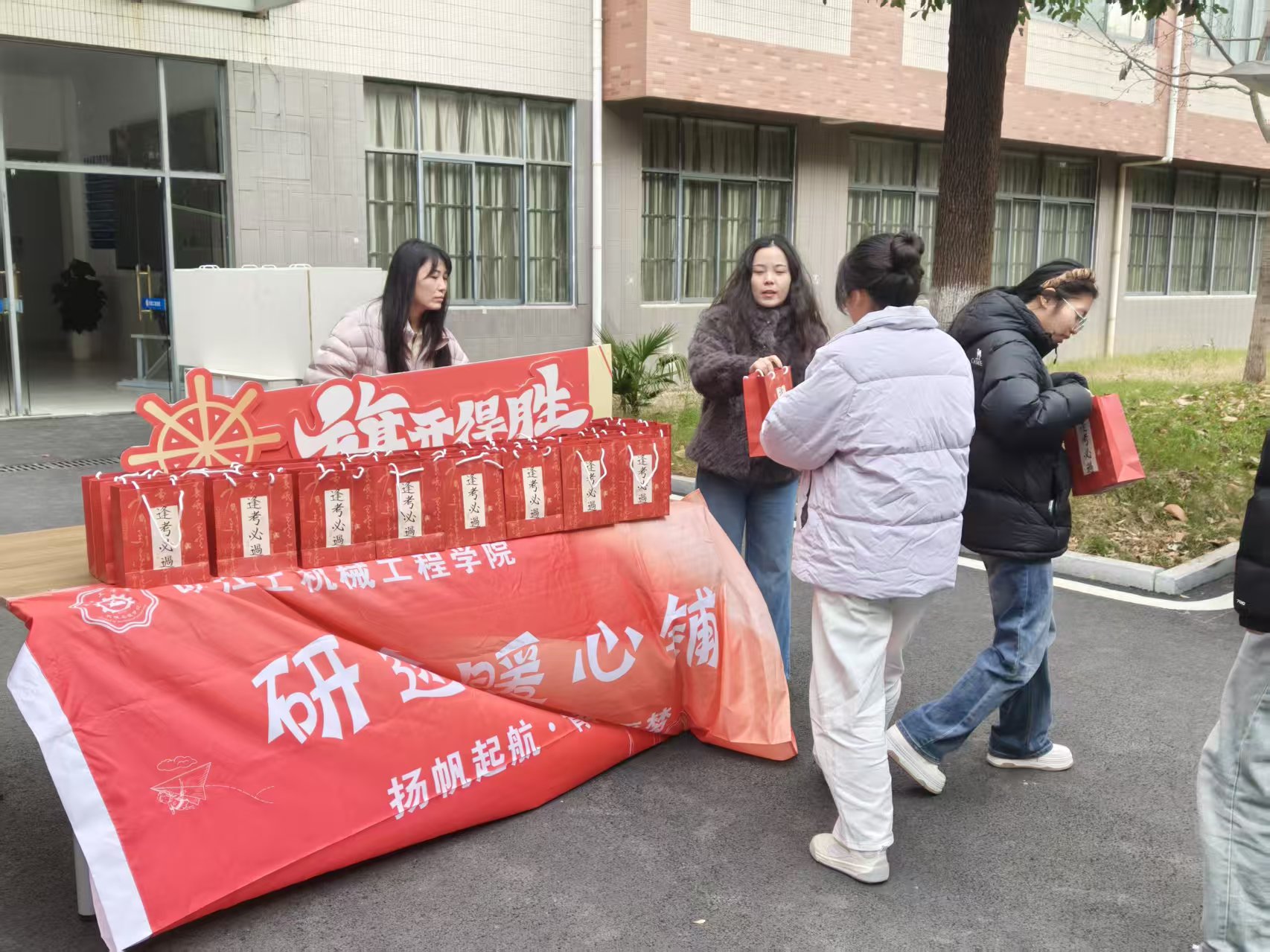 寒冬岁末,考研在即。为缓解学子备考压力、传递学院关怀,2025年12月4日,华体汇apk机械工程学院于敦行楼楼下开展考研慰问活动。学院院长朱天宇、院党总支副书记颜婷婷、院分团委汪娟老师来到活动现场,为冲刺阶段的考研学子送上慰问礼品与暖心祝福。