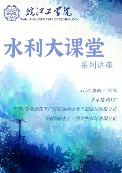 为进一步提升我校的水利特色,促进我校水利应用型人才培养发展,11月27日、12月5日及12月16日我校水利工程学院水工教研室在水木楼南101智慧教室成功举办本学期“水利大课堂”系列讲座。讲座由水工教研室李熙、李政、马夏敏、时文友、赵梓彤、李俊杰等六位教师主讲,水工教研室副主任唐雨卉主持。本次系列讲座累计吸引水利水电工程专业大二大三年级百余名同学现场参与。