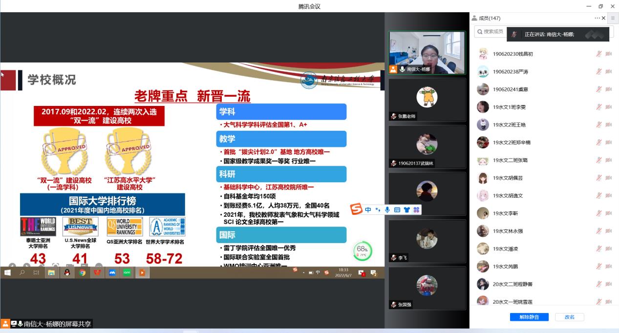 随后,杨娜院长为同学们介绍了南京信息工程大学学科建设和专业情况。被誉为“最有温度大学”的南京信息工程大学位于江苏省会城市南京,自1960年建校以来,隶属于中央气象局,由江苏省人民政府、中国气象局、教育部、国家海洋局共同建设。南信大是以大气科学为特色、海洋、信息、环境、管理等多个学科和谐发展的全国重点大学,被称为“中国气象人才的摇篮”,南信大也凭借其引以为豪的大气科学于2017年入选国家“双一流”建设大学,并成为江苏省重点培养的特色。