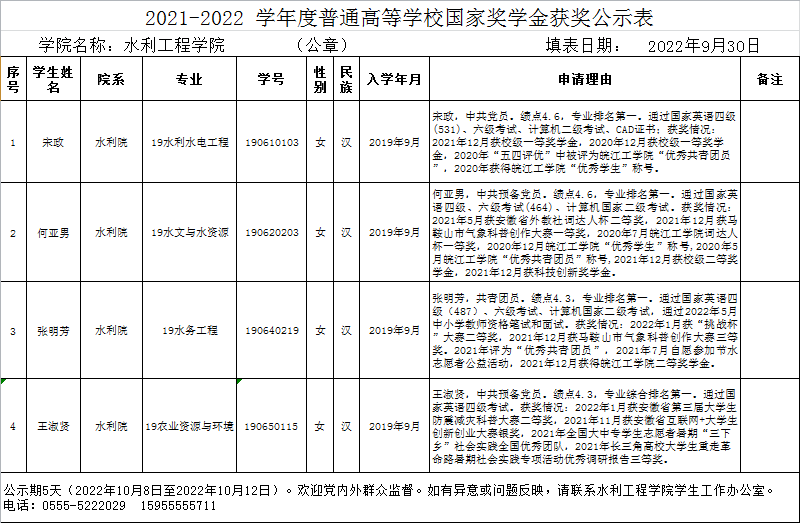水利工程学院2021-2022年度国家奖学金公示